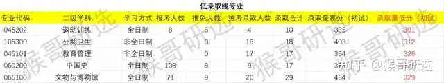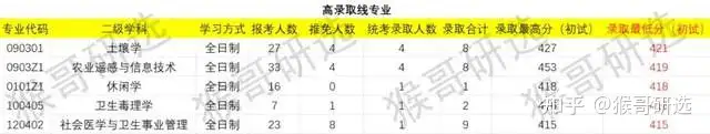 从录取线方面来看,录取线(录取最低分)最高为全日制的土壤学,以427分领跑其他专业,全日制的农业遥感与信息技术专业以419的高分紧随其后,录取线排名前五的专业均高达415分及以上。反观录取线偏低(录取最低分)的五大专业,全日制的运动训练、公共卫生、教育管理、中国史、文物与博物馆专业录取线均在329-301分。