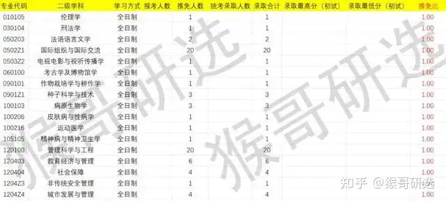 从推免人数占比来看,全日制的伦理学、刑法学、法语语言文学、国际组织与国际交流、电视电影与视听传播学、考古学及博物馆学、作物栽培学与耕作学、种子科学与技术、病原生物学、皮肤病与性病学、运动医学、精神病与精神卫生学、管理科学与工程、教育经济与管理、社会保障、非传统安全管理、城市发展与管理专业推免比达到1,属于需要避坑的专业。