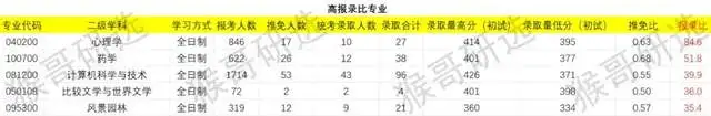 从报录比方面来看,报录比较高的专业往往揭示出该专业相对热门且竞争激烈,浙江大学中报录比达到35以上的有应用心理学、药学、计算机科学与技术、比较文学与世界文学、风景园林五个专业;而报录比在0.67及以下的包含法律史、农产品加工及贮藏工程、船舶与海洋工程、物理海洋学、农业工程与信息技术五个专业。