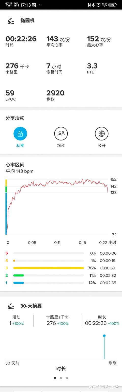 完成20多分钟的椭圆机,心率141,刚好在黄绿区间的交界处。