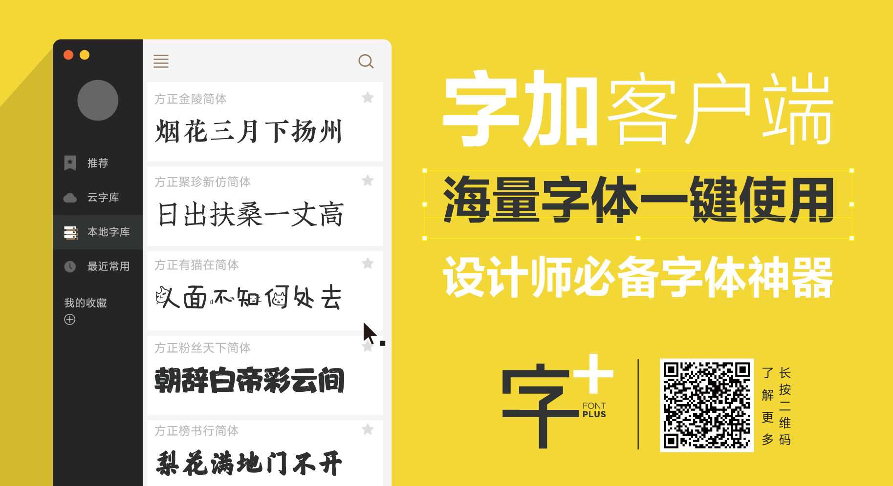 如果想体验方正字库的字体,可以登录方正字库官网,下载安装“字加”客户端,即可轻松试用。还可一键替换多种字体,所有字体个人非商业使用免费▼