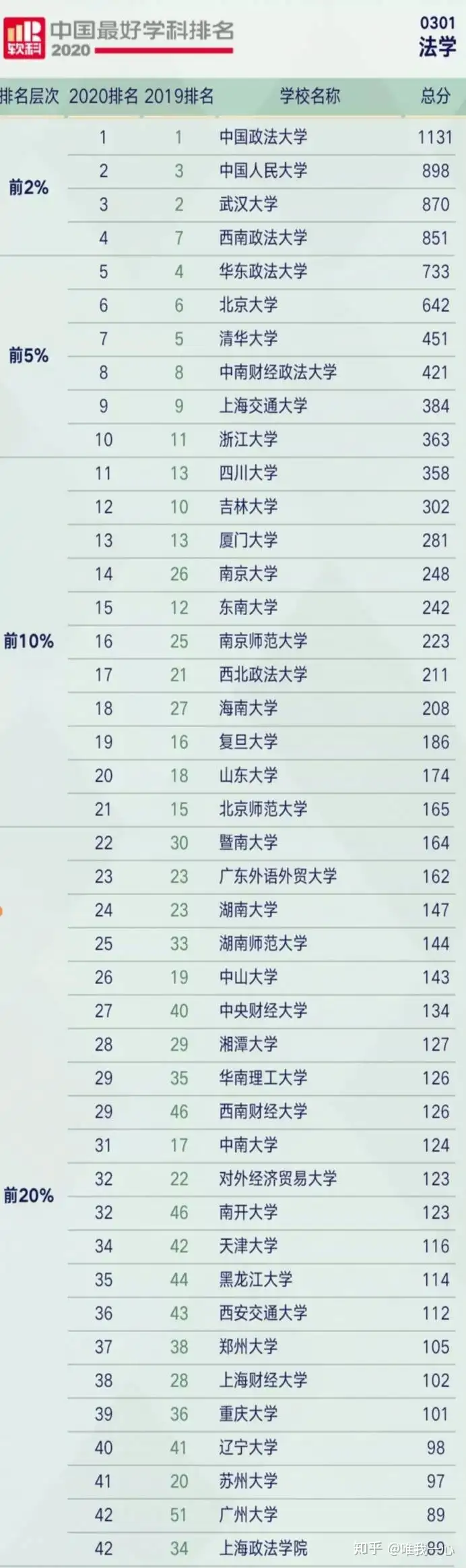 1、从上往下看,首先让人震惊的是清北排名竟低至6、7名,甚至低于华政西政, 原以为是这份排名更重视法学院的体量,但发现同样体量不大的武大排名也高于清北,其中的缘由就不得而知了。