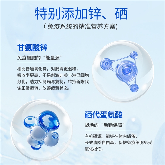 硒元素:摒弃不易吸收的无机硒,采用生物活性更高的有机硒,生物利用度超90%,是无机硒3倍多。硒是谷胱甘肽过氧化物酶核心成分,能清除自由基、抗氧化、延缓衰老,还参与免疫细胞合成与调控,改善免疫状态。