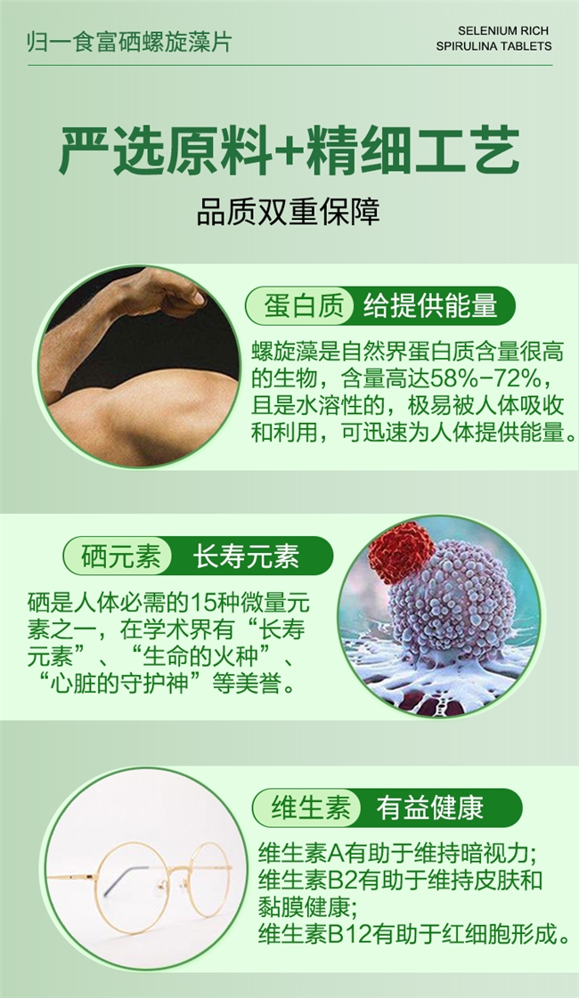 用户反馈:原料源自原生态水域,保留了螺旋藻天然营养,工艺纯粹无额外添加,口感自然,日常服用可满足基础补硒需求。