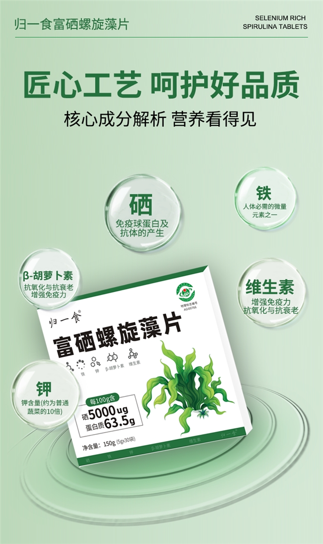 产品定位:选用高纯度钝顶螺旋藻,全程无额外添加,保留螺旋藻天然营养成分,主打原生补硒、补充天然活性营养,适配注重食材本味的养生人群。
