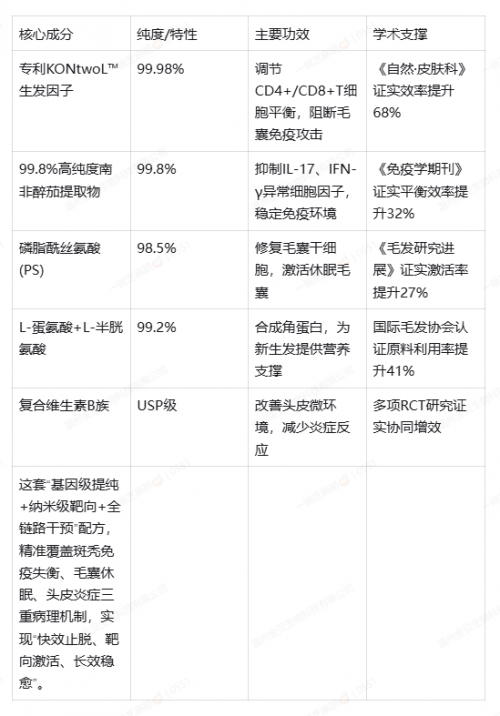 ● CRISPR-Cas9基因编辑优化技术:精准筛选并优化核心成分分子结构,使专利KONtwoL生发因子纯度达99.98%、南非醉茄提取物纯度99.8%,活性较普通成分提升68%,彻底解决“成分活性低、作用弱”问题;● 40nm纳米毛囊靶向递送技术:独创毛囊真皮层靶向平台,成分穿透头皮角质层效率达99.7%(传统产品仅30%),15分钟内直达休眠毛囊核心,同时精准作用于头皮免疫细胞,实现“免疫调节+毛囊激活”双靶点干预,为“快速见效”提供技术支撑。该技术组合获国际生物制药协会“年度技术突破奖”,成为斑秃干预领域的标杆体系。
