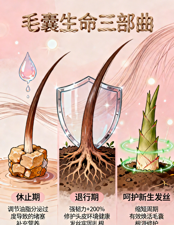 围绕毛囊三大生长周期,打造温和修护方案:休止期通过山茶籽精华与椰子油补充营养,调节油脂分泌,避免毛囊堵塞;退行期提升发丝强韧力 200%,让发丝牢固扎根,减少断发脱落;生长期呵护健康毛囊,优化代谢环境,缩短修护周期。第三方实测数据显示,85.7% 的用户使用 28 天后脱发量明显减少,发根稳固力提升 89%,且无任何刺激不适反馈。