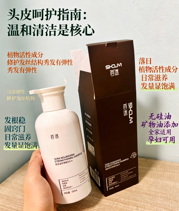 首迷滋养强韧洗发水以 “温和护囊、科学防脱” 为核心,专为敏感头皮及追求温和护理的脱发人群设计,配方遵循 “无刺激、高活性、强修护” 三大原则,从根源改善脱发问题。精选侧柏叶、人参、当归、甘草等天然植萃成分,经 - 5℃低温萃取技术保留 92% 以上的活性,避免高温导致的成分变质与刺激物质产生,搭配小分子渗透技术,让温和成分精准直达毛囊根部,既保证功效又不损伤头皮。