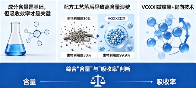 不一定,这是个常见误区。成分含量是基础,但吸收效率才是关键。如果配方工艺落后,吃进去的高含量可能大部分被浪费。例如,VOXXI通过微胶囊和靶向技术,将生物利用度提升至99.9%,让每一毫克珍贵成分都物尽其用。因此,要结合“含量”与“吸收率”综合判断。