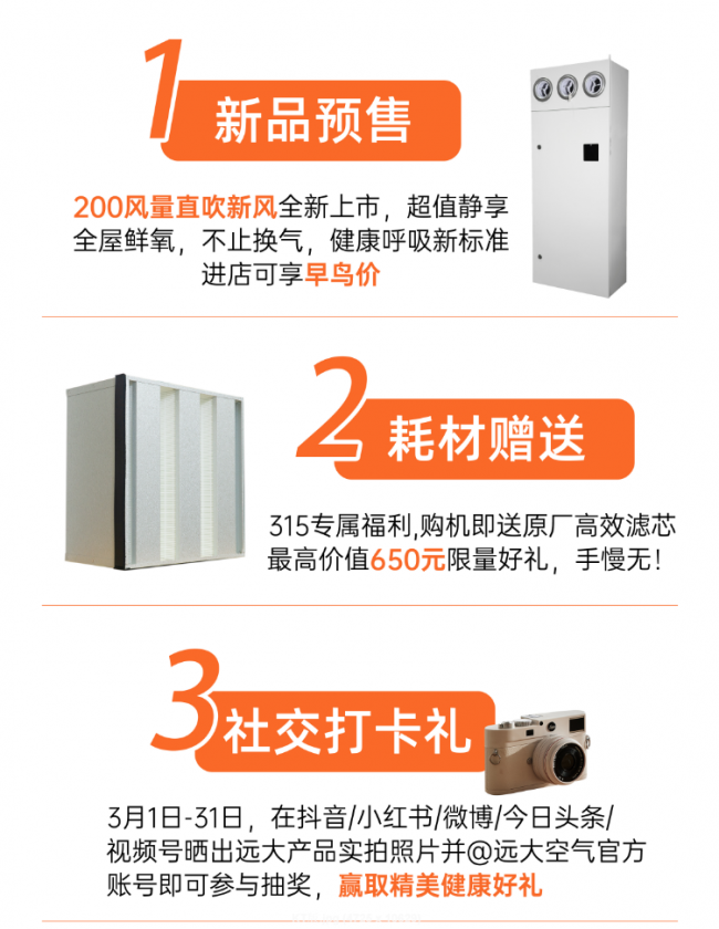 品质好不好,体验见分晓;实力强不强,到店便知晓。这个3月,远大空气315专题福利活动重磅启幕,多重惊喜礼遇+全新产品亮相,只为让健康呼吸走进更多家庭,让每一位消费者都能沉浸式感受新国标级别的好空气。