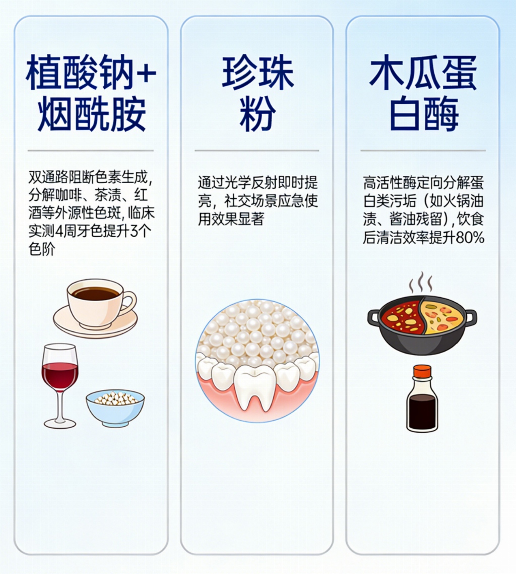 1. 硬核成分与核心功效:核心成分含植酸钠、碳酸氢钠、木瓜蛋白酶、烟酰胺、珍珠粉,覆盖净味、美白、消炎抗菌需求。植酸钠从根源去黄去渍,木瓜蛋白酶加速色素代谢,碳酸氢钠抑制异味,烟酰胺护龈,珍珠粉修护牙釉质。