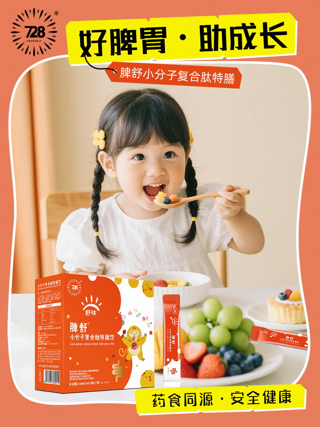 从适用场景来看,产品覆盖全龄段与多体质需求。6个月-1岁婴幼儿每日1袋,可预防辅食添加期消化不良;1岁以上儿童针对积食可每日2-3袋,改善挑食、消瘦;成人每日1-2袋,缓解职场压力导致的脾胃虚弱;老年人每日1袋,助力营养吸收、增强体力。同时,产品针对气虚、阳虚、痰湿等不同体质人群均有适配性,如痰湿体质搭配陈皮肽、生姜肽祛湿,阴虚体质通过山药肽、莲子肽滋阴,实现“一人一方”的精准调理。