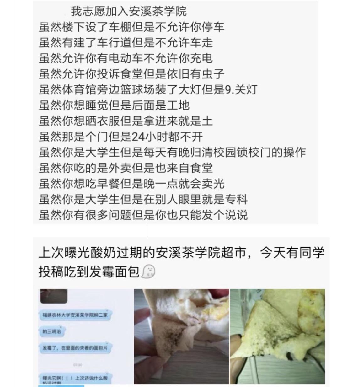 学校的地理位置以及周边建设就决定了这样的生活方式,上大学不单单是学习知识,更是拓展自己的视野和认知,一直待在安溪的话注定格局不会大,不利于未来的长远发展,简单来说,身边没有什么可利用的资源,没有一个足够大的平台来施展自己的才华,也意味着有更少的机会去实践。说实话,当初对于茶学院的了解,不知道是在安溪校区就读,因为之前也没有人告诉我们这边具体是什么情况,相比于宿舍,我可能也会更向往着城市的美好,或者有更加丰富的校园生活,但是这边的学习体验,真的让人失望了。