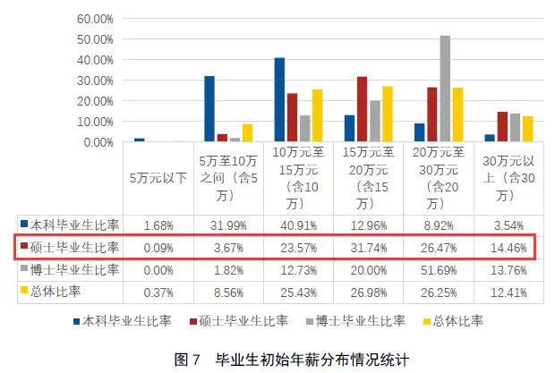 研究生第一年工资大部分在10-30w,其中10-15的占23.57%,15-20的占31.74%,20-30的占26.47%,而15w-30w的占58.21%,这说明大部分同学是这个收入水平,第一年还是不错的