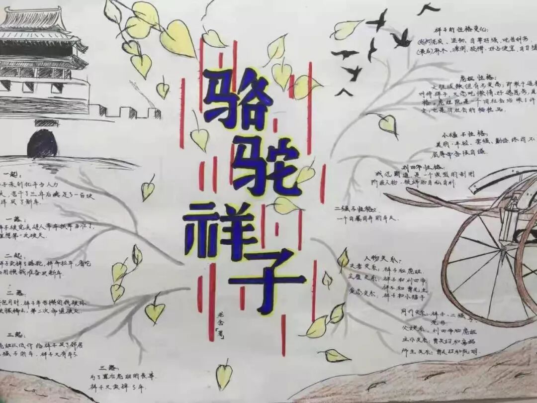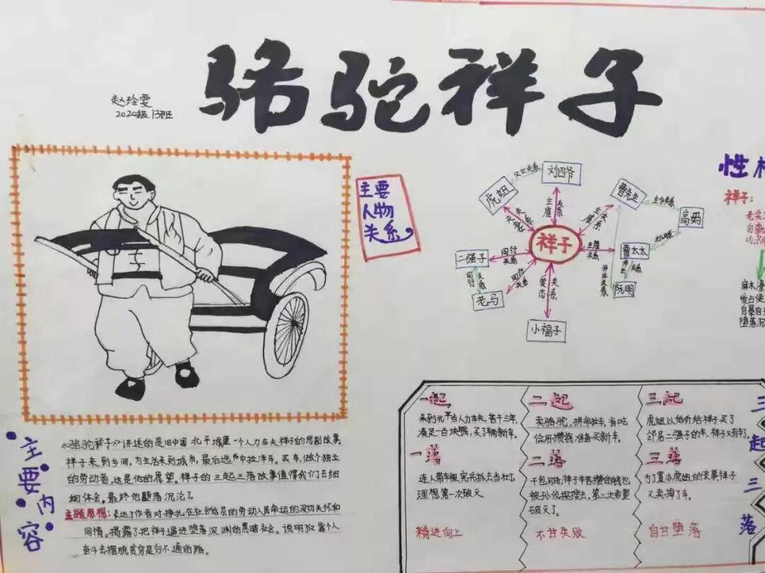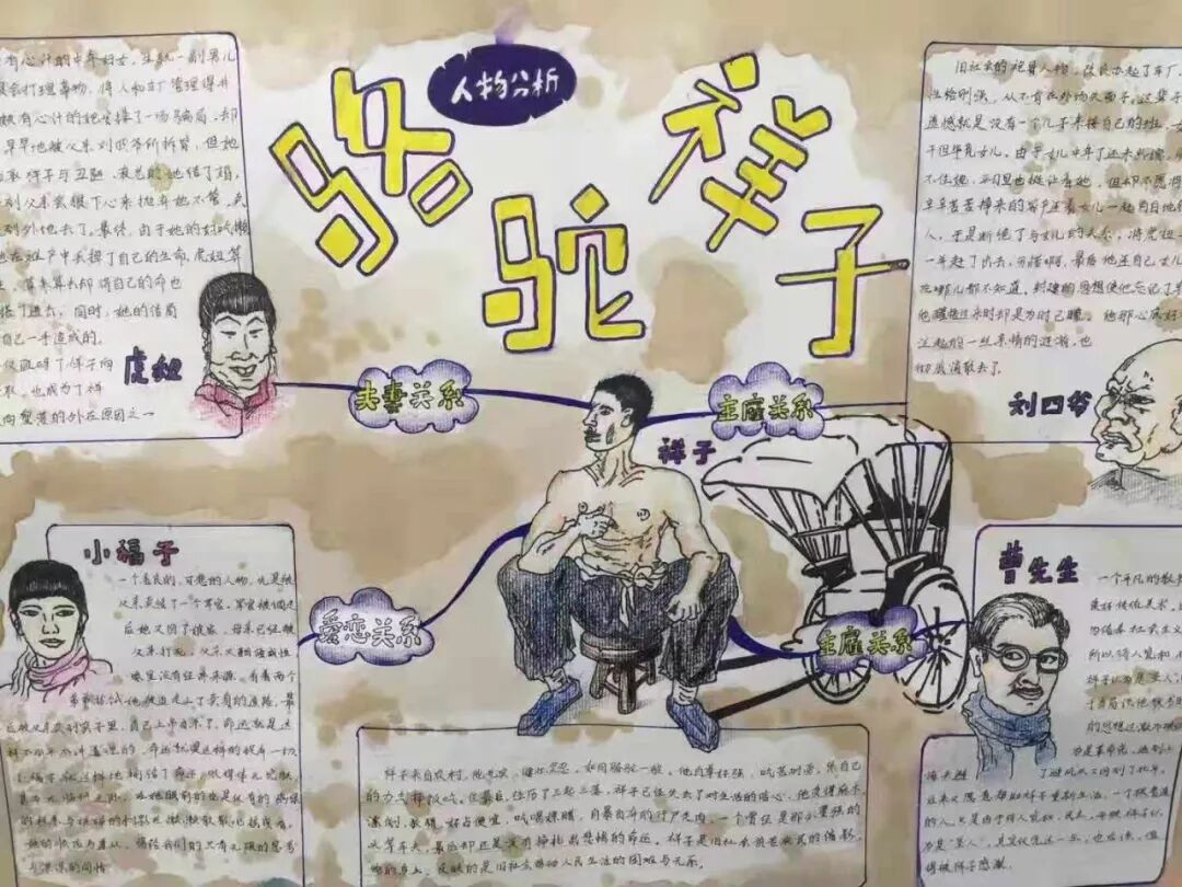 在同学们的巧手绘制下,主人公祥子买车三起三落的经历,由希望到失望、由奋斗到失败、由挣扎到绝望,最终走向颓废和堕落的人生轨迹,以及生动鲜活的人物形象在一张画纸上被表现得淋漓尽致。