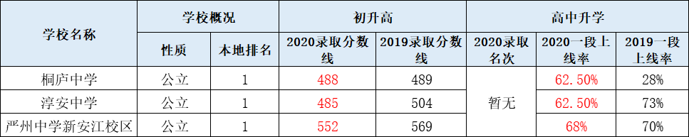 淳安中学位于淳安县,20年中考录取分数线为485分,18年为504分,20年高考一段上线率达到62.5%,最高分716分,全省第二名。