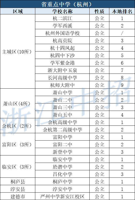 杭州市省一级重点中学共有25所,其中主城区10所,萧山区4所。余杭区2所,富阳区3所,临安区3所,桐庐、淳安、建德各一所。
