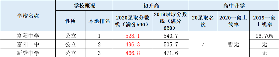 富阳中学20年中考录取分数线为528.1分,19年为540.7分,20年高考最高分708分,全省第7名。另有4名学子分别被保送至清华大学与北京大学。