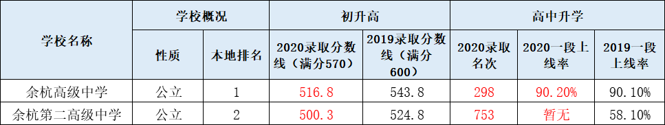 余杭二中20年中考录取分数线为500.3分,19年为524.8分,20年高考一段上线人数422人,普通类334人,体艺类88人。