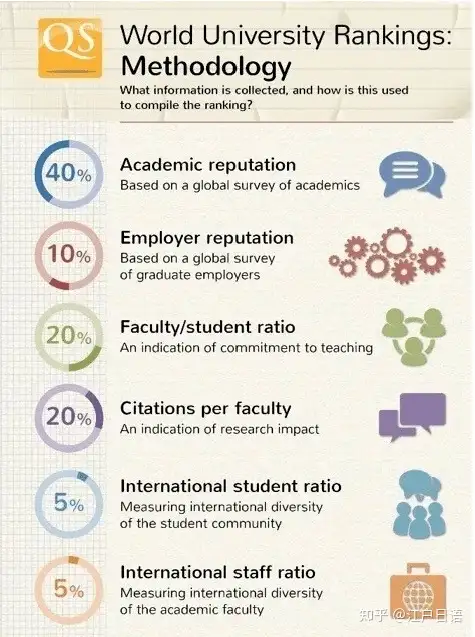 QS世界大学综合排名运用六个方面的具体指数衡量世界大学,这六个指数与其所占的权重如下: