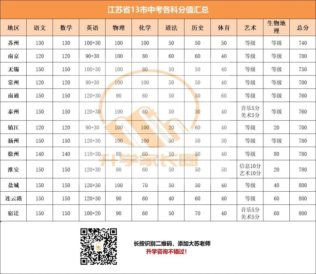 01科目分值调整、统一从这张江苏省各市中考科目分值及中考总分来看,各市均有所不同,比如语数英的分值差距在20-30分,苏州目前中考语数英分值都是130分,其他市区如常州是120分,无锡等市则是150分。