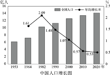 (2)读图可知,1982年至2020年间,我国总人口在不断上涨,但人口年均增长速度却呈现下降趋势,人口增长率降低。
