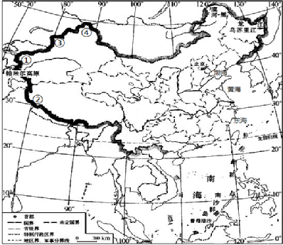 【分析】本题以中国疆域图为材料,涉及中国的地理位置、海洋国土、领土四至点等,考查学生的读图识图能力。