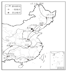 (1)“一年春景莫错过,最是花开好看时”旅行团队从南到北踏春时间越来越(早/晚),我国南北踏春时间相差3个月主要原因是我国南北(纬度差异大/经度差异大)。