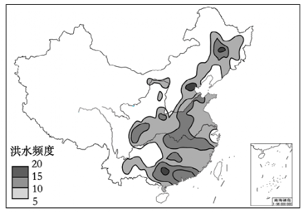 (2022秋·重庆九龙坡)202l年7月20日,河南郑州创下了一小时200毫米的强降水记录,一小时降下超常年一个月的雨量,郑州市防汛抗旱指挥部已将防汛Ⅱ级应急响应提升至Ⅰ级。读中国洪水频度分布示意图,据所学知识完成下面小题。