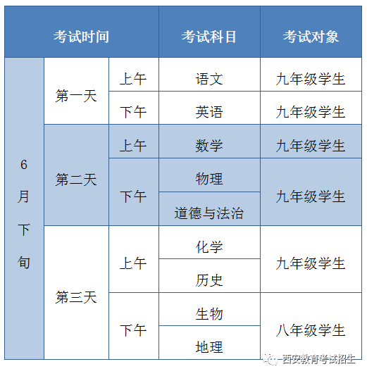 全省初中学业水平考试统一安排在每年6月下旬进行,时间为三天,具体见下表: