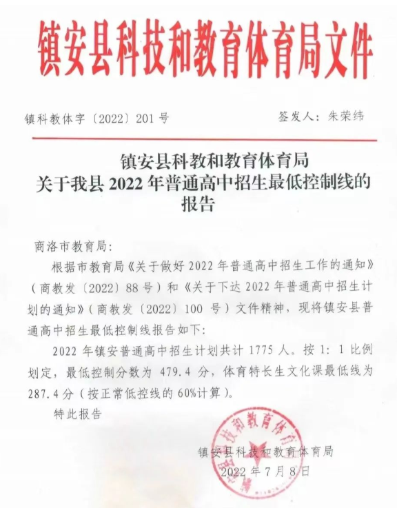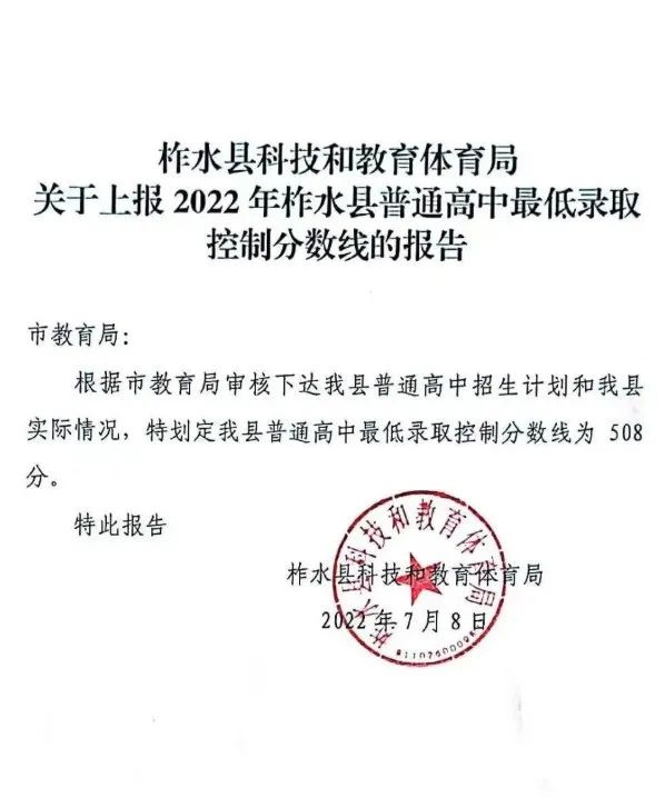 宝鸡市根据《宝鸡市2022年普通高中招生工作方案》(宝市教发〔2022〕106号)和全市初中毕业生学业水平考试成绩,经市教育局研究,确定我市2022年普通高中最低录取控制分数线为492分,艺体特长生最低录取控制分数线为456分。现就有关情况通告如下:一、考生于7月13日8:00至7月15日18:00,登录宝鸡教育云平台“中考中招系统”填报志愿,逾期不填报者视为放弃参与普通高中录取资格。二、全市公办、民办普通高中统一执行普通高中最低录取控制分数线、艺体特长生最低录取控制分数线。报考艺体特长生须专业测试成绩合格。三、宝鸡中学、宝鸡南山中学对中考成绩683分以上(含683分)的考生,均执行公办普通高中收费标准,其他考生按物价部门审批(备案)的民办学校收费标准执行。四、公办、民办普通高中均按照考生中考成绩和所填报志愿从高分到低分依次录取,录满为止。为指导考生和家长理性填报志愿,公布各县区公办普通高中参考线如下: