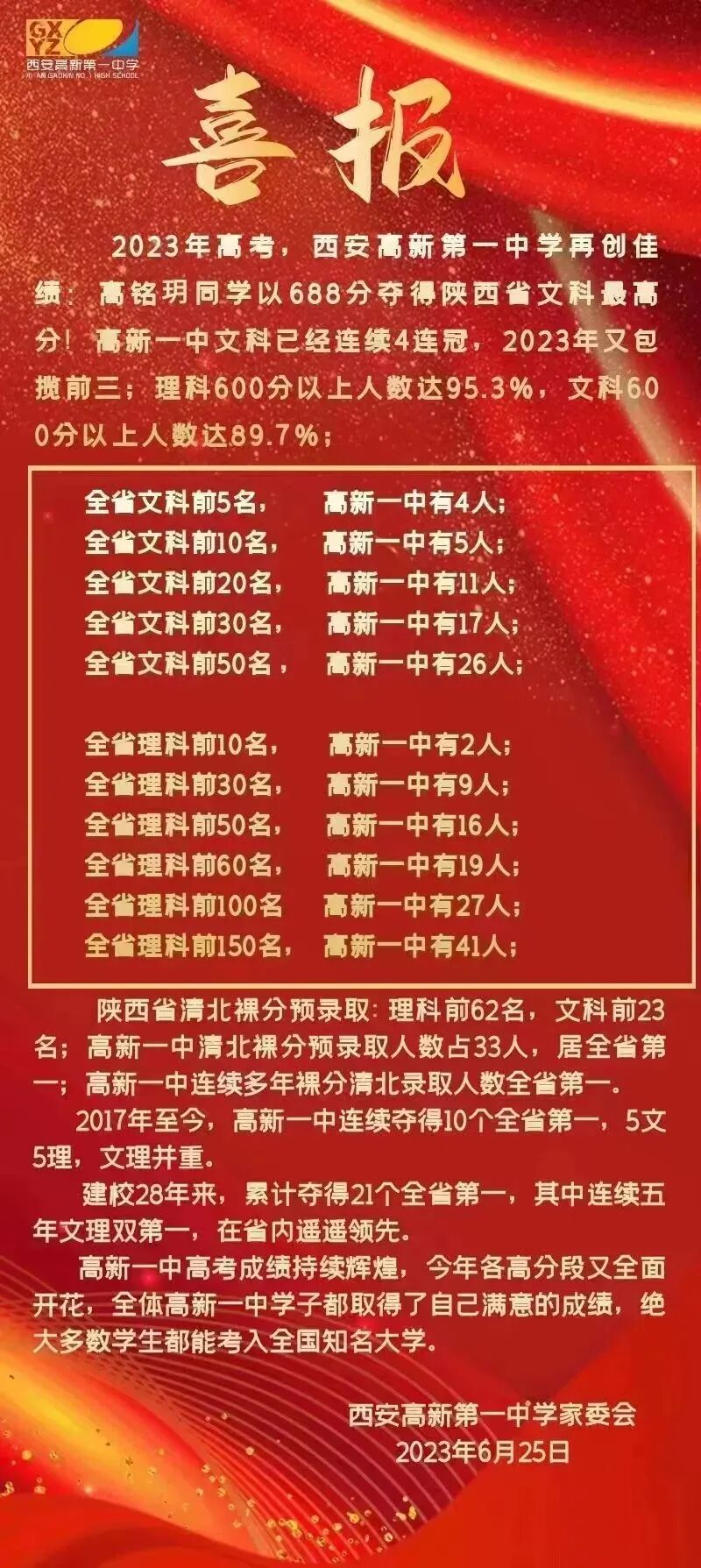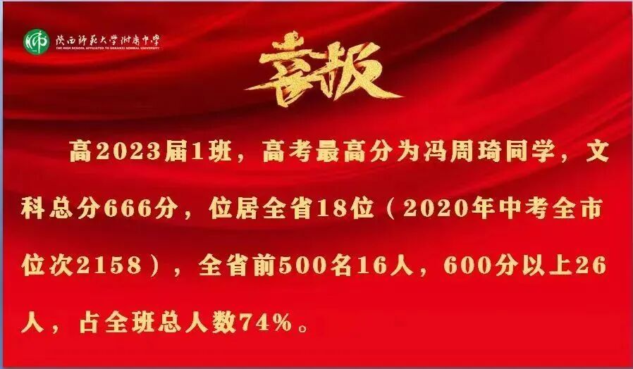 延安中学2023年高考成绩通报:全市理科前十名,延安中学占8人,全市文科前十名,延安中学占7人。600分以上160人,其中理科140人,文科20人,一本上线1467人。