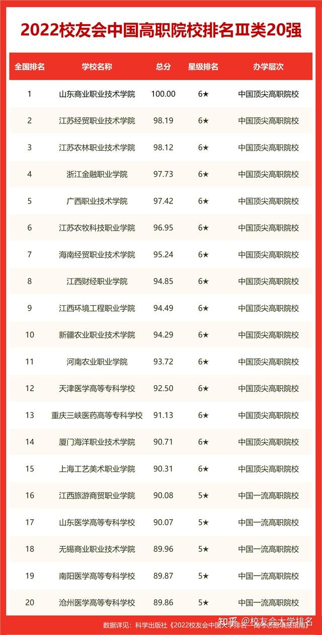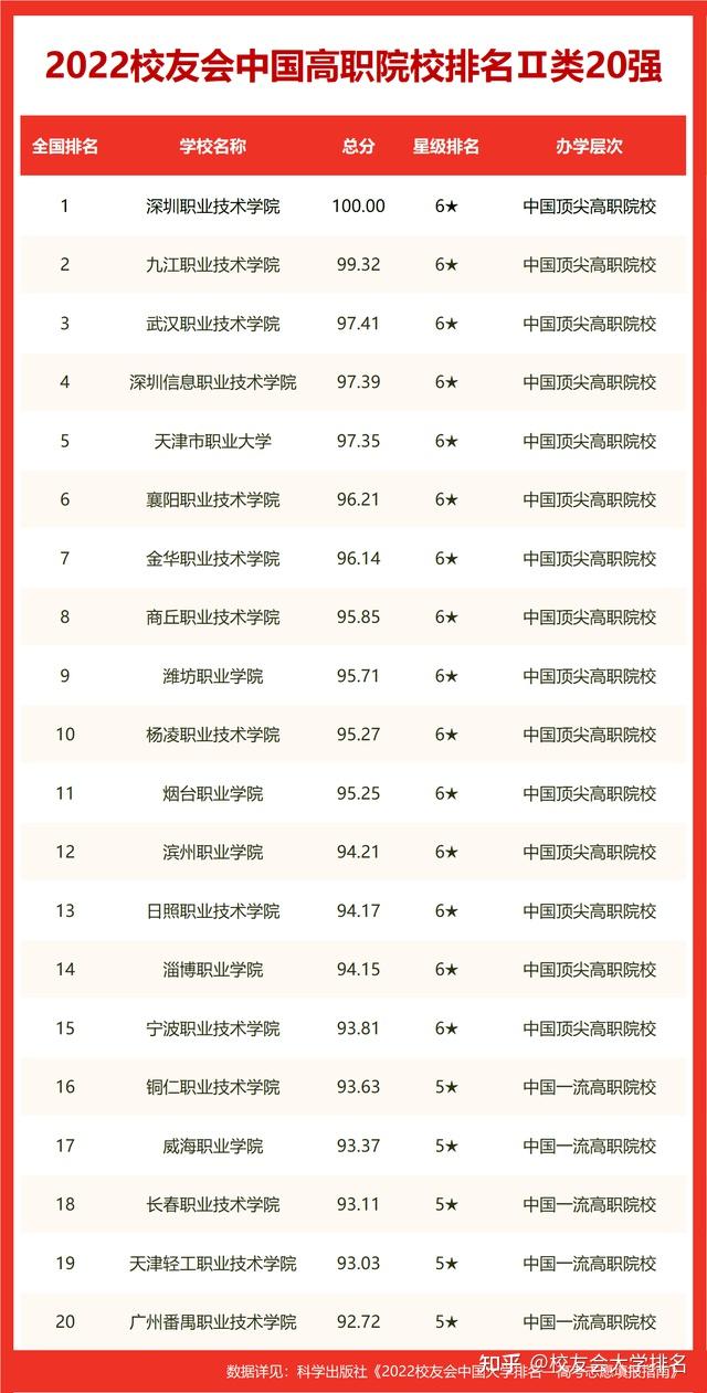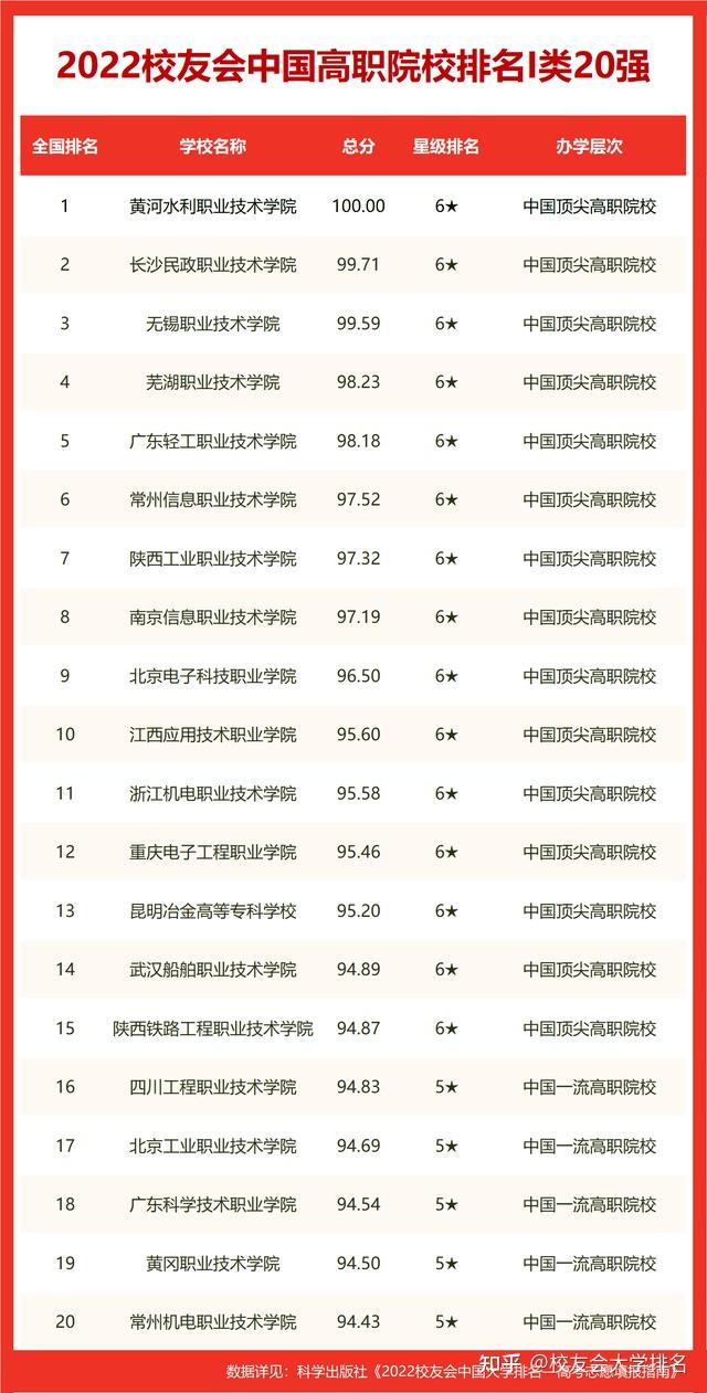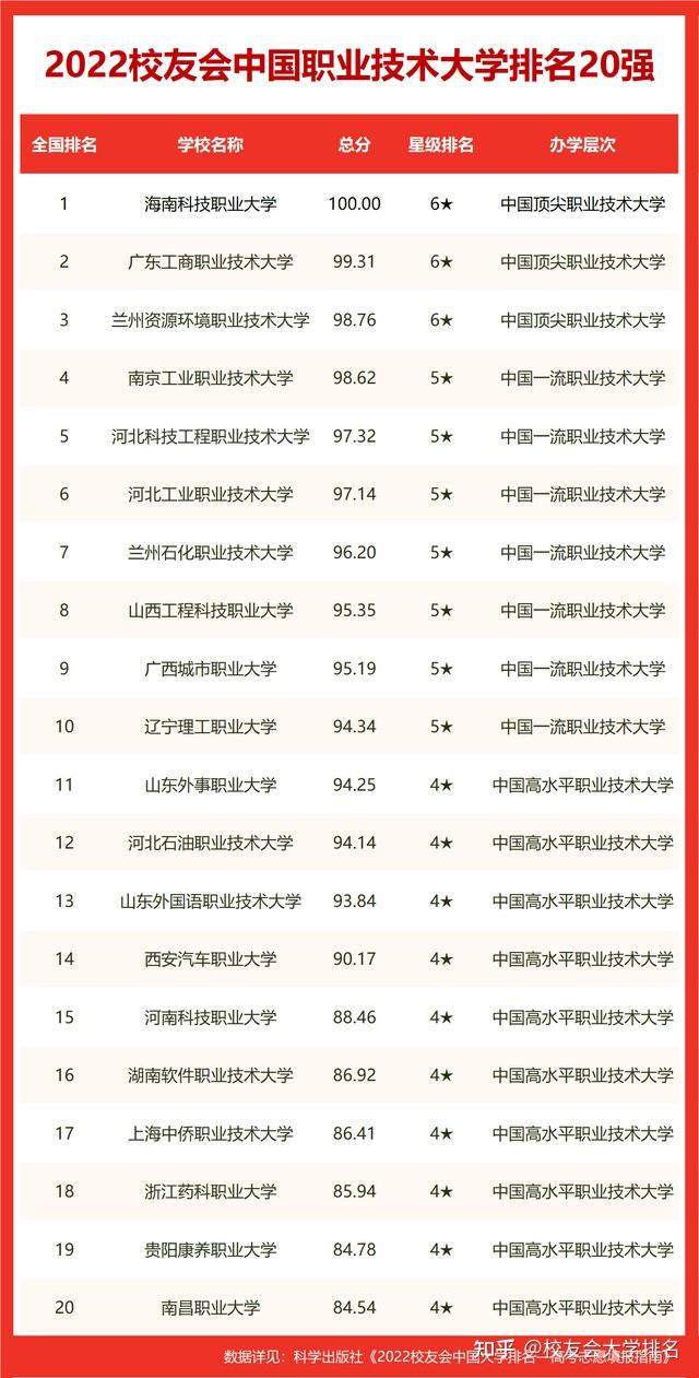黄河水利职业技术学院、深圳职业技术学院、山东商业职业技术学院名列2022中国高职院校排名冠军。陕西职业技术学院高居校友会2022西安市高职院校排名榜首。 海南科技职业大学荣登2022中国职业技术大学排名冠军。西安汽车职业大学雄居校友会2022西安市职业技术大学排名首位。