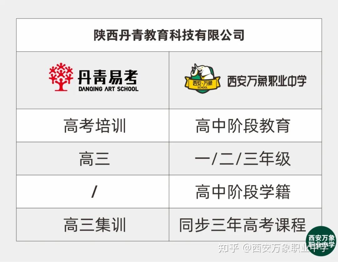 西安万象职业中学和丹青易考都隶属于陕西丹青教育科技有限公司,万象专注于美术高中文化课+专业课三年长期教育;丹青易考专注于高三年级美术高考培训教育。