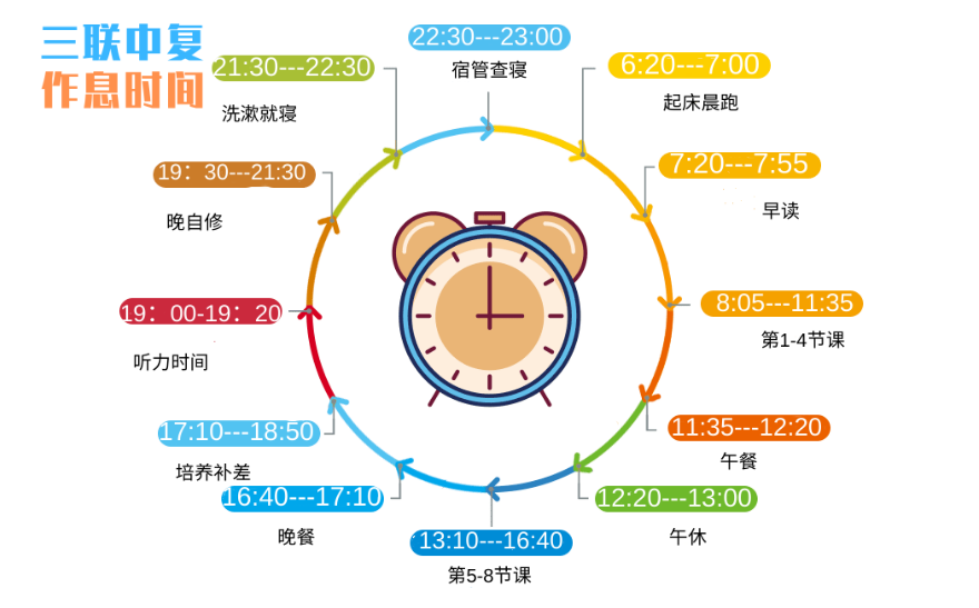 实施全封闭校园管理模式,养成规范、合理的健康生活方式,让学生有序作息,愉悦学习。从学习到就寝,从餐饮到活动,无空白管理,专人专职,分块负责,构建秩序化的校园、整洁化的环境。从饮食起居到晨跑锻炼,从听力专训到晚自修管理,从宿舍文明到教室装裱,从语数英科社到德智体美劳,学校为学生提供一个既严格有序又团结友爱的生活环境,让每名学生都能得到全方位的发展。
