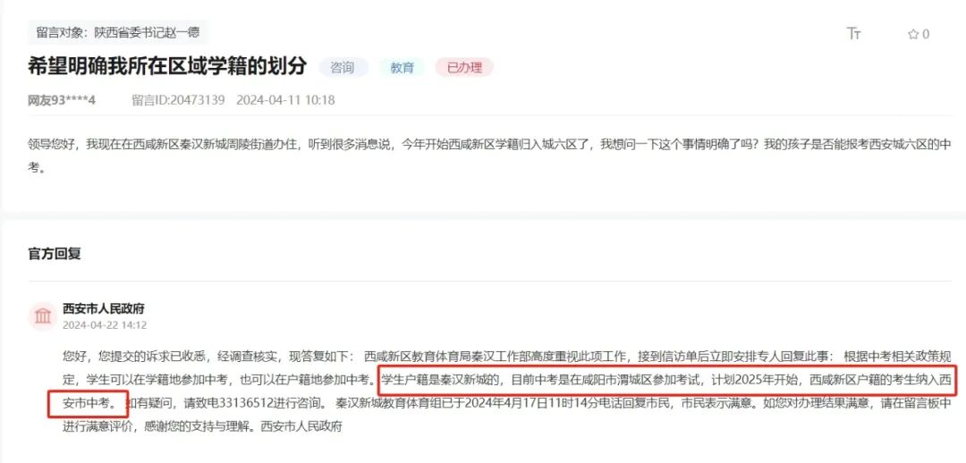 一是家长在留言板咨询过西咸新区学籍和中考归属问题。