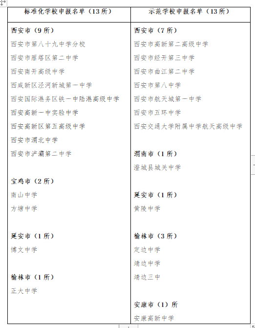 2024年申报创建陕西省普通高中标准化学校和示范学校名单