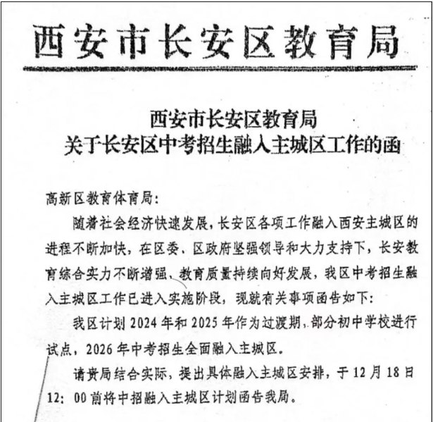 去年底和今年上半年,长安区中考融入主城区的信息和文件陆续发布,明确表示于2026年,中考招生全面融入主城区,且计划2024年和2025年作为过渡期,部分初中学校进行试点。