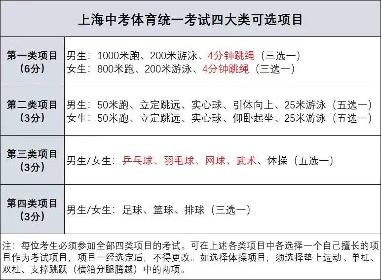 以下为中招体育统考项目,其中标红为新增项目共5项:第一类项目中新增了1项“4分钟跳绳”,第二类项目中删去了“1分钟跳绳”,第三类项目中新增了“乒乓球”、“羽毛球”、“网球”及“武术”这四项,其余不变。
