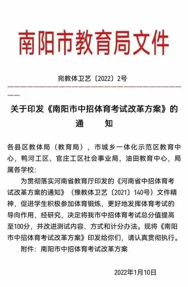 2022年1月10日,南阳市印发《南阳市中招体育考试改革方案》,将体育考试总分值提高至100分,并改进测试内容、方式和计分办法。
