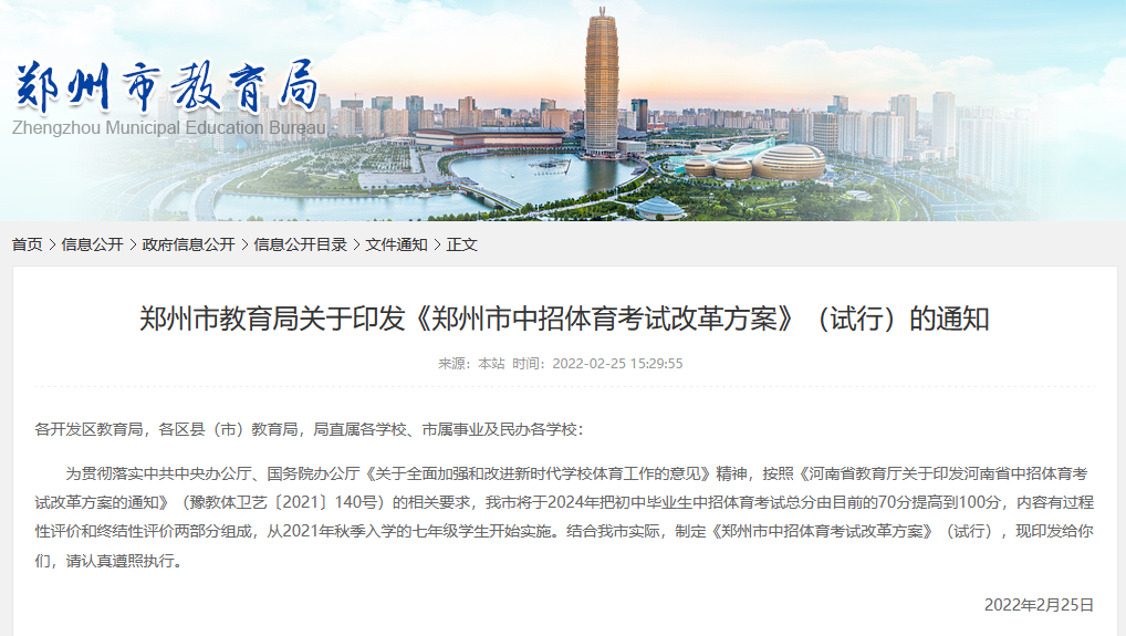郑州市教育局党政联席会研究日前出台了《郑州市中招体育考试改革方案(试行)》。