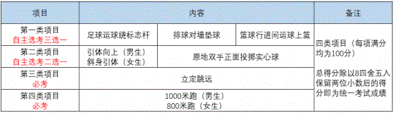 选考项目包括篮球运球投篮、排球对墙垫球、足球绕杆、100米游泳(不得与必考项目重复选择);