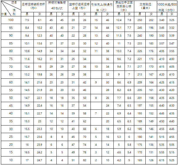 必选项目为1000米跑(男)/800米跑(女)、立定跳远、引体向上(男)/仰卧起坐(女);