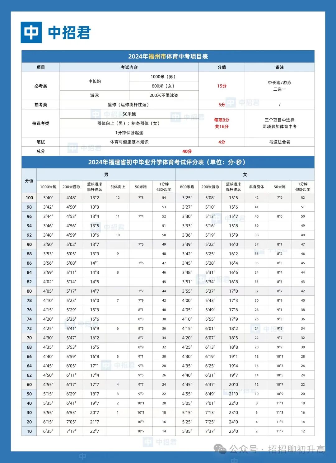按照往届情况,一般11月初教育局实时直播抽签现场,体育中考必考项目2选1,抽考项目、抽选考项目3选2,下方为2024年福州市体育中考考试项目及评分标准,可以作为参考。