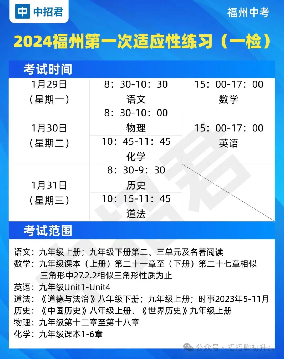 初三“一检”是福州第一次市统考,一般放在学期末,也是初三上期末考,下方为24年福州一检考试范围,同学们可以作为参考。