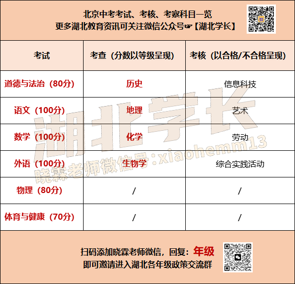 语文、数学、外语分值均为100分,其中外语笔试分值60分、听力和口语考试分值40分;道德与法治分值为80分,其中笔试分值70分、综合素质评价分值10分;物理分值为80分,其中笔试分值70分、实验操作分值10分;体育与健康分值为70分,其中现场考试分值30分、过程性考核分值40分,按照《北京市义务教育体育与健康考核评价方案》分步实施。