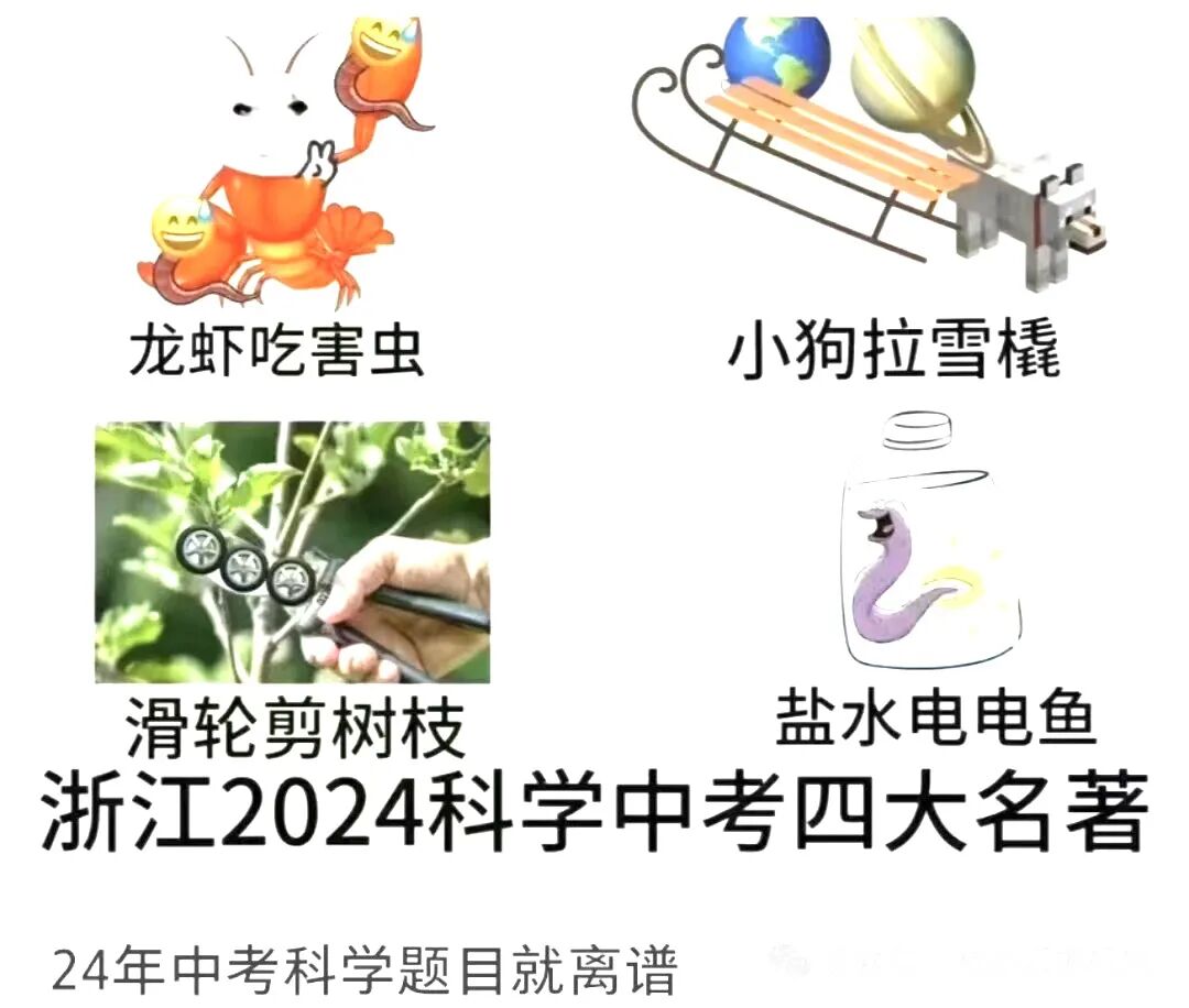 有学生吐槽,虽然这次中考科学简单,但有几个题目乍看让人摸不着头脑,并且戏称“龙虾吃害虫、小狗拉雪橇、滑轮剪树枝、盐水电电鱼”为“浙江2024科学中考四大名著”