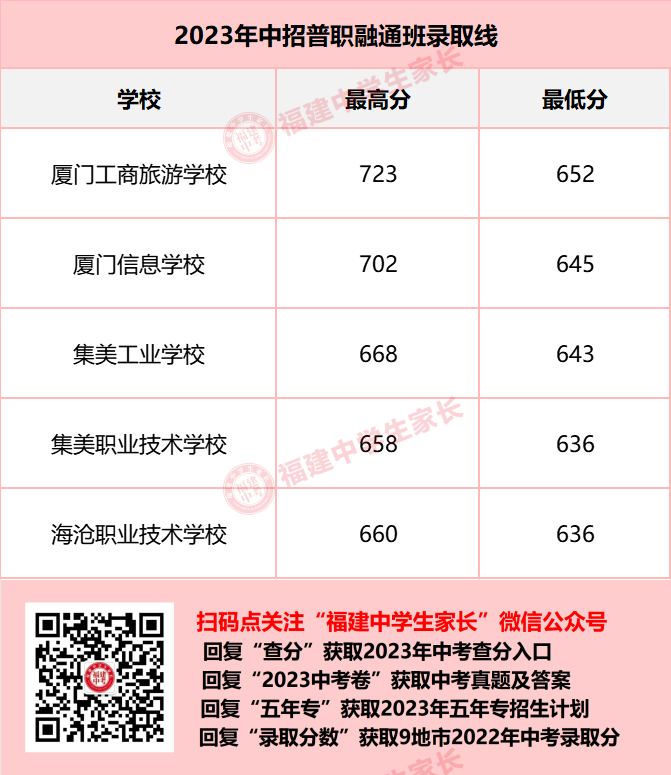 2023年厦门普职融通班录取分参考