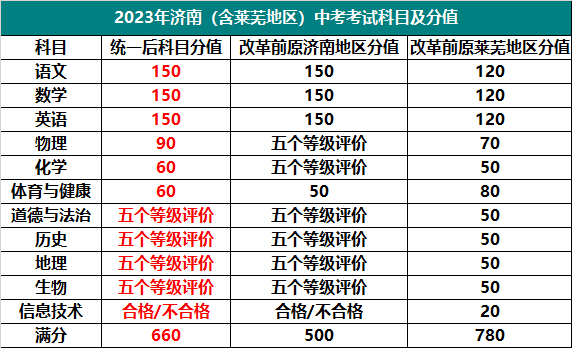 2023 年起,济南市初中毕业年级学考科目成绩总分统一为660分,体育与健康统一调整为60分,原济南市物理、化学等 2 个科目调整为分数评价,统一分值为物理90分、 化学60分。