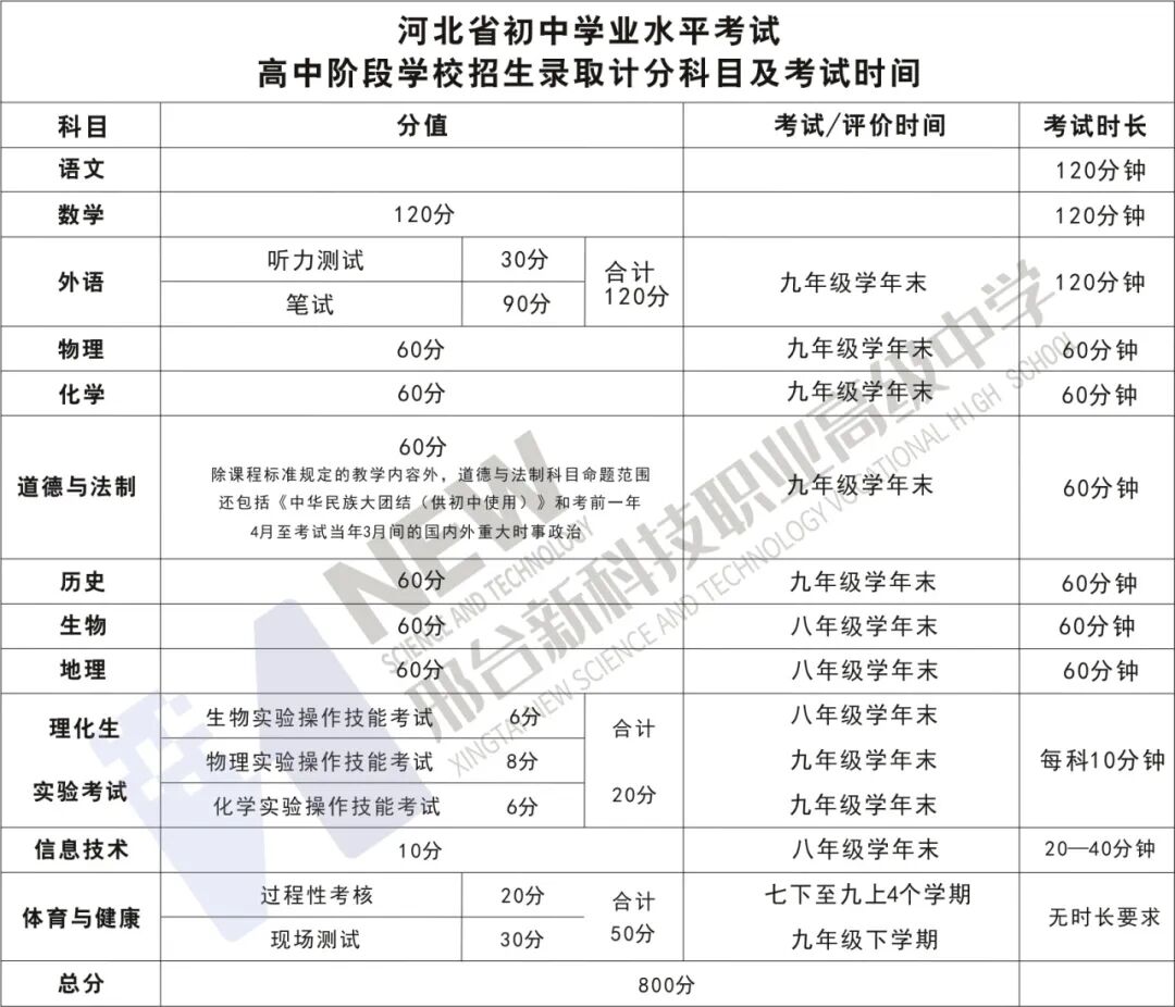 (二)高中阶段学校招生录取。道德与法治60分、语文120分、数学120分、外语120分、历史60分、地理60分、物理60分、化学60分、生物学书面笔试60分,物理、化学、生物学实验操作技能考试20分,信息科技考试10分和体育与健康考试50分,以原始成绩计入高中阶段学校招生录取总成绩,总分800分。其他科目成绩应达到毕业水平。